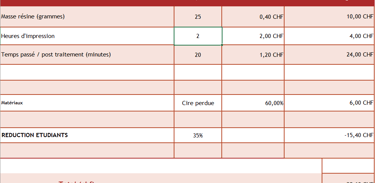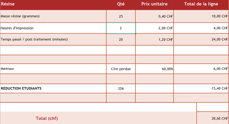 La masse du modèle, calculée sans les supports. Le tarif est de 0,40 CHF par gramme de résine utilisé.