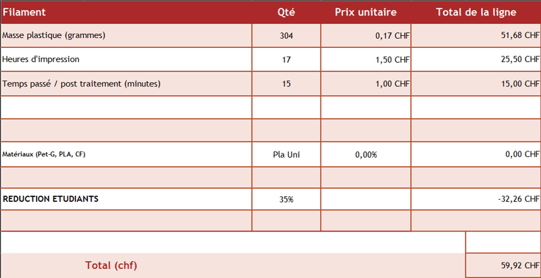La masse du modèle, calculée sans les supports. Le tarif est de 0,17 CHF par gramme de filament utilisé.